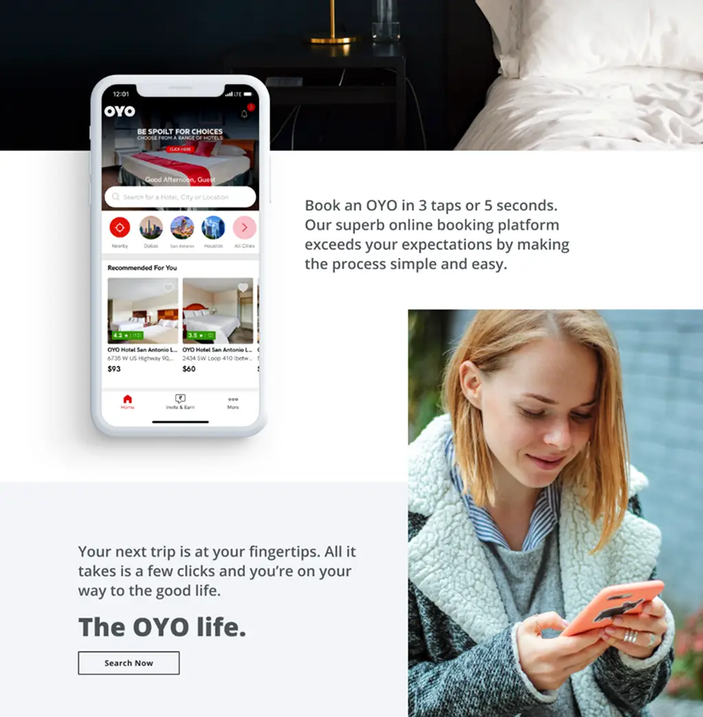 Although OYO had a global website template built for the Indian market, it lacked the localization and aesthetic appeal required to engage US and UK consumers. Recognizing this gap, OYO partnered with UpTop to perform a visual redesign of its US and UK websites to align with regional expectations and improve the overall user experience.